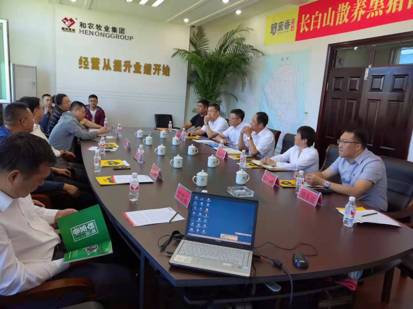 和農(nóng)牧業(yè)集團董事長方彥明先生在會議室向劉紅軍區(qū)長做了深入的工作匯報,介紹了公司的基本情況,并為大家詳細的講解了集團雙卡模式以及黑豬放養(yǎng)模式,對企業(yè)的未來發(fā)展方向進行闡述。隨后劉區(qū)長對和農(nóng)牧業(yè)集團的發(fā)展模式給予了高度的評價和肯定,并當場表示,政府會積極的為企業(yè)解決問題幫助企業(yè)發(fā)展。